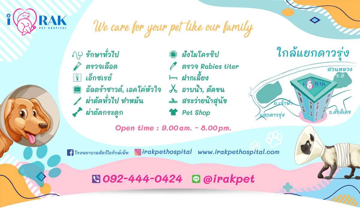 I RAK PET Hospital Phuket (โรงพยาบาลสัตว์ไอรักษ์เพ็ท) – ศูนย์การแพทย์สัตว์เลี้ยงครบวงจร โรงพยาบาลสัตว์ใจกลางเมืองภูเก็ตที่เพียบพร้อมด้วยเครื่องมือแพทย์ที่ทันสมัย ให้บริการครอบคลุมตั้งแต่การรักษาทั่วไปจนถึงเคสผ่าตัดซับซ้อน พร้อมบริการฝากเลี้ยง (Pet Hotel) สำหรับเจ้าของที่ต้องการการดูแลระดับมืออาชีพ